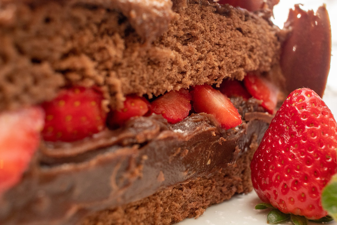 Pão de ló de chocolate, recheio de chocolate com morango e cobertura de raspas de chocolate.